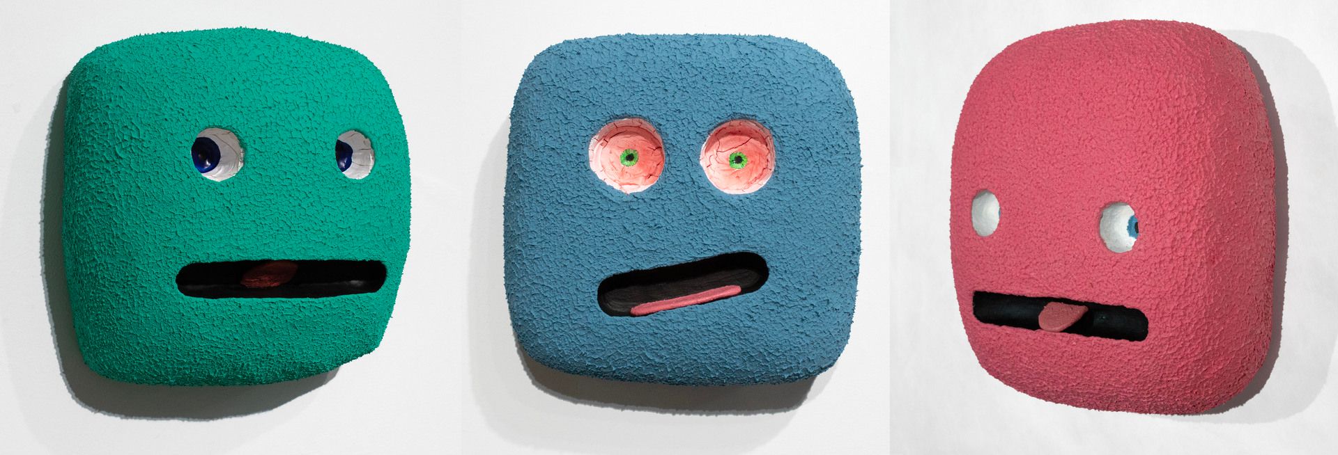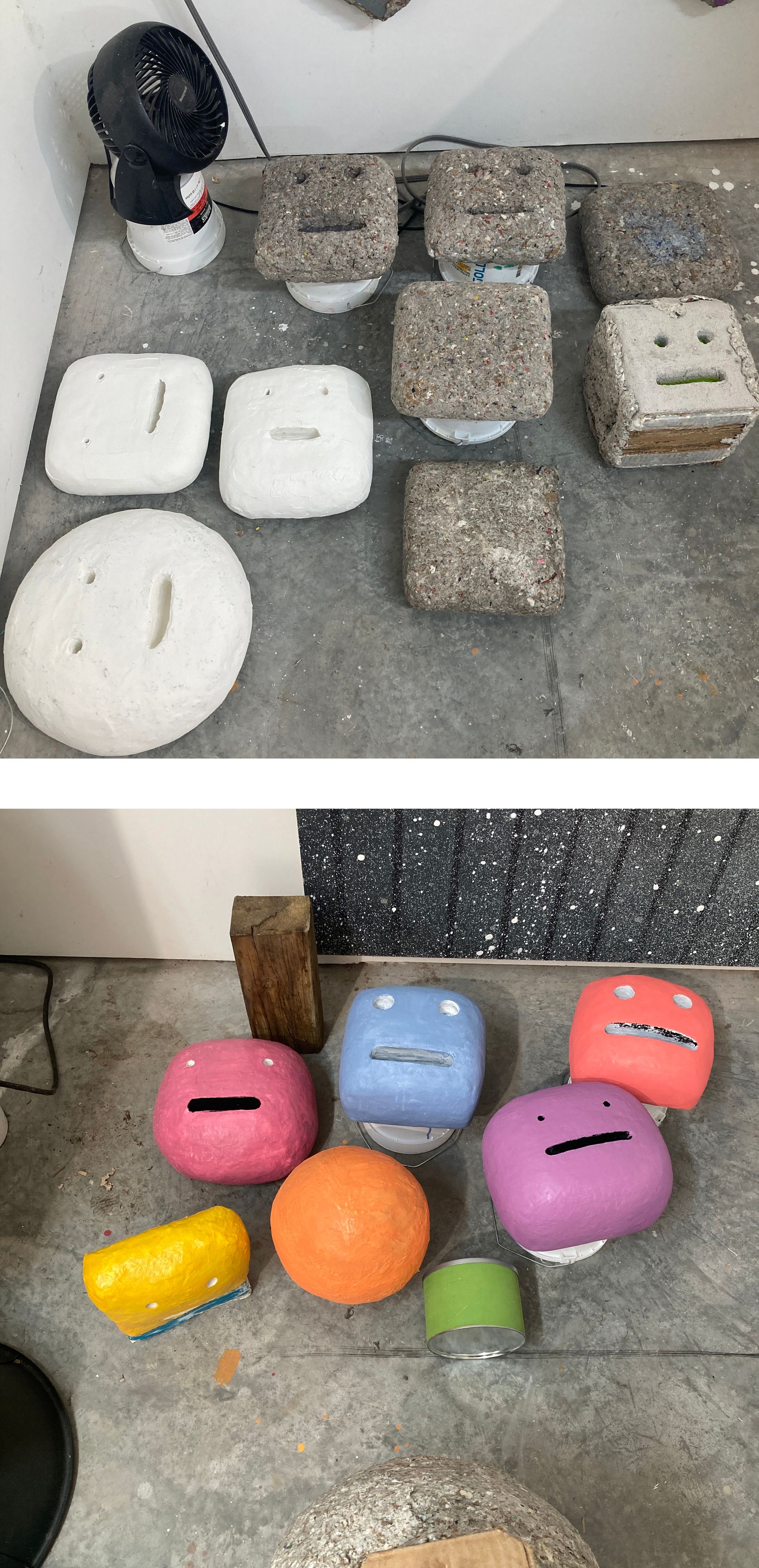 Brave, brave Stephanie Theodore, owner and operator of Theodore, a gallery I’ve been working with for over 10 years, has yet again invited me to do whatever I want. This time around we’ll be in a temporary, second floor space in the same Tribeca building she’s run the gallery from for the past five years. This past summer I finished a series of 22 heads I had been working on for at least two years. Working slowly, layering and sanding, painting, layering and sanding some more, then drilling, sawing and cutting features followed by several more rounds of layering and sanding is generally how these came to exist. The top coat, as you can see in images of the final work above, is what I call “the landlord special.” The paint puckering technique used on the walls of every apartment I ever lived in, and some ceilings too, employed to hide any defects. | ![]() studio progress this summer |